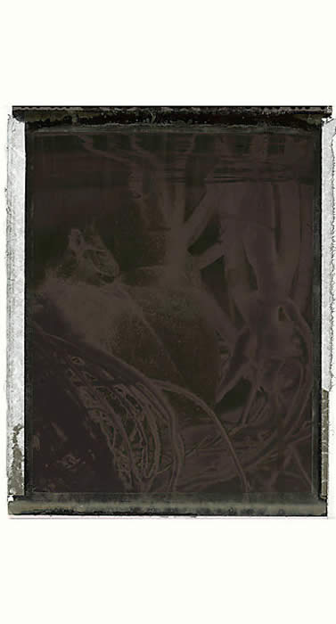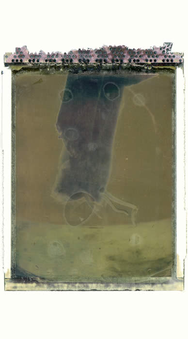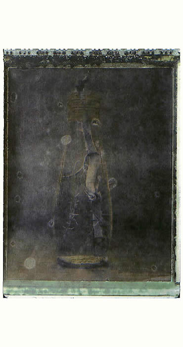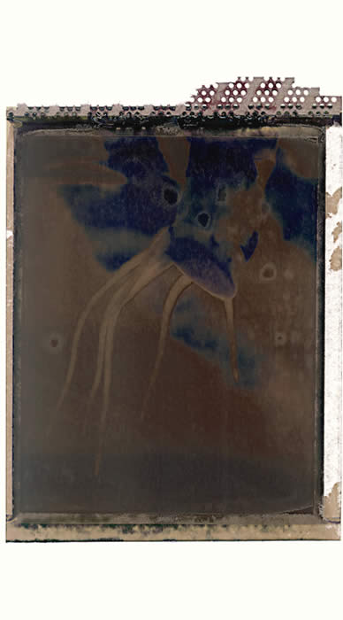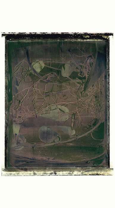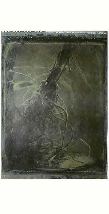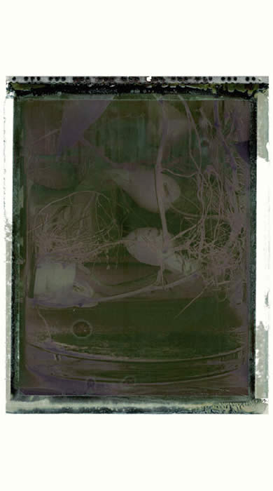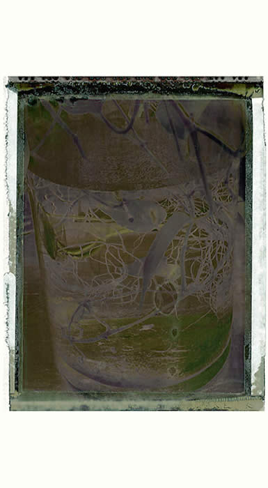 Rootnegs The Rootnegs are explorations of the life force as expressed by seemingly dead and inert plant cuttings which, after some weeks, miraculously sprout new roots and come to life within their glass water-filled containers. I started to document this thinking I would scan the Polaroid color prints and make from them large digital prints in ink on paper. But the gooey peel-apart Polaroid negatives caught my attention. I remembered them from my childhood; their color, although strange, had a particular nostalgia for me, as did the sandwich of materials comprising the "negative" (not really a true negative, nor a true positive.) I ended up scanning the gooey negatives (quickly, before they dried and faded) and making 40x50 inch prints on scrolls of Shiramine mulberry paper. This way of working is a takeoff from the conventional "Polaroid transfer" process, in which the negative is pressed against paper and the image transferred. But rather than yielding a small unique print, the rootnegs are large and have an edition size of 7.